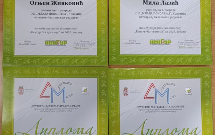 I ove školske godine se na nivou naše škole održalo takmičenje iz matematike " Kengur" na kome su učestvovali učenici nižih i viših razreda. Najuspešniji su bili učenici 1.razreda Ognjen Živković, Mila Lazić, učenik