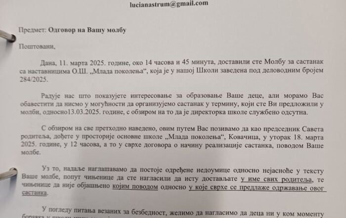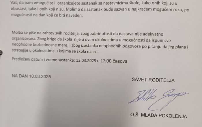 Škola ovim putem demantuje tvrdnje da ne želi saradnju sa roditeljima, prvenstveno na to ukazuje činjenice da su sednice Saveta roditelja održane dva puta u prethodnih mesec dana, odnosno – 12. februara i 04.