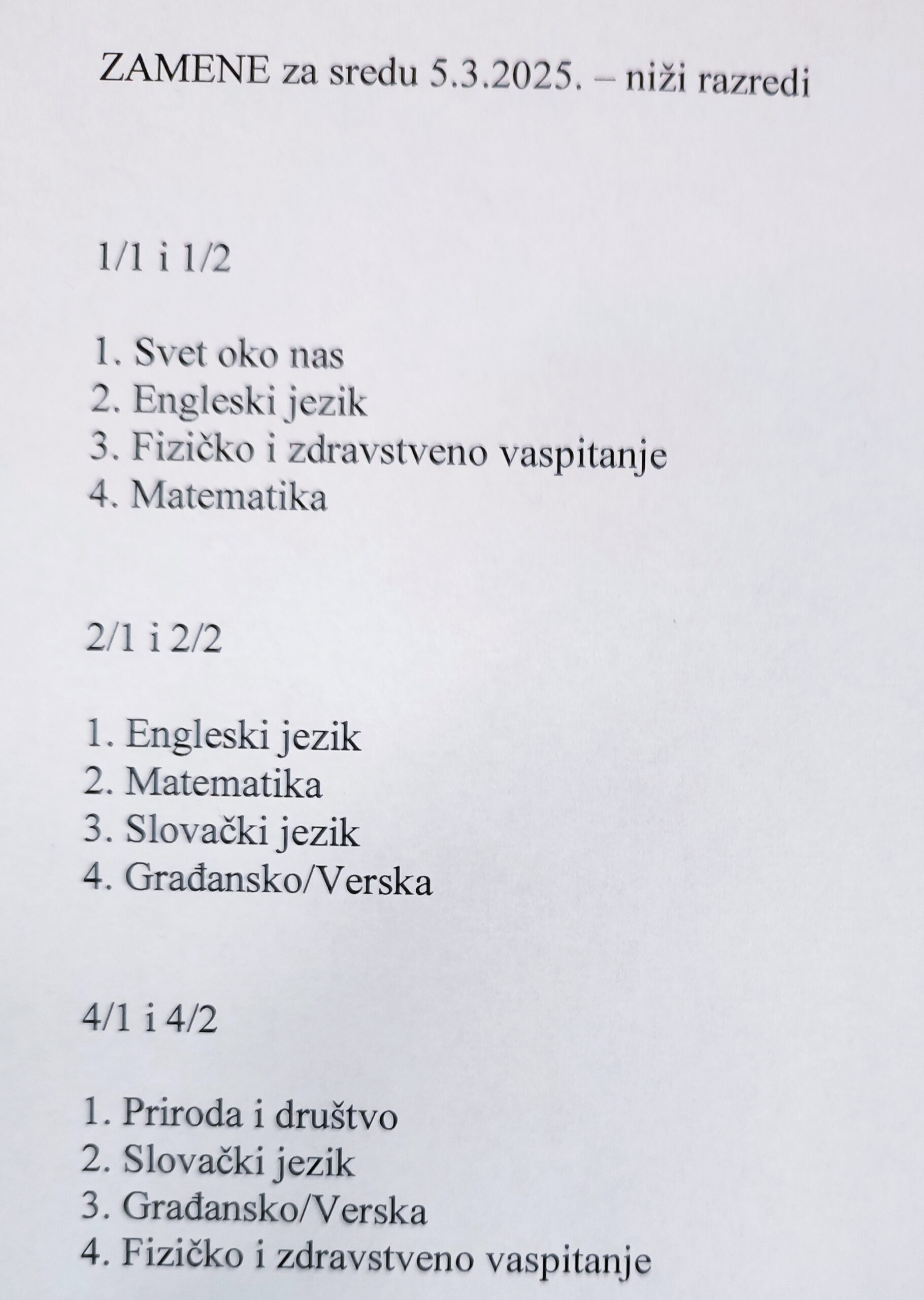 Za odeljenja nižih razreda, nastava počinje u 07:30, odeljenja čiji nastavnici su obustavili rad će imati četiri časa, časovi će trajati 45 minuta uz obezbeđene zamene. (zamene možete pogledati na slici ispod).