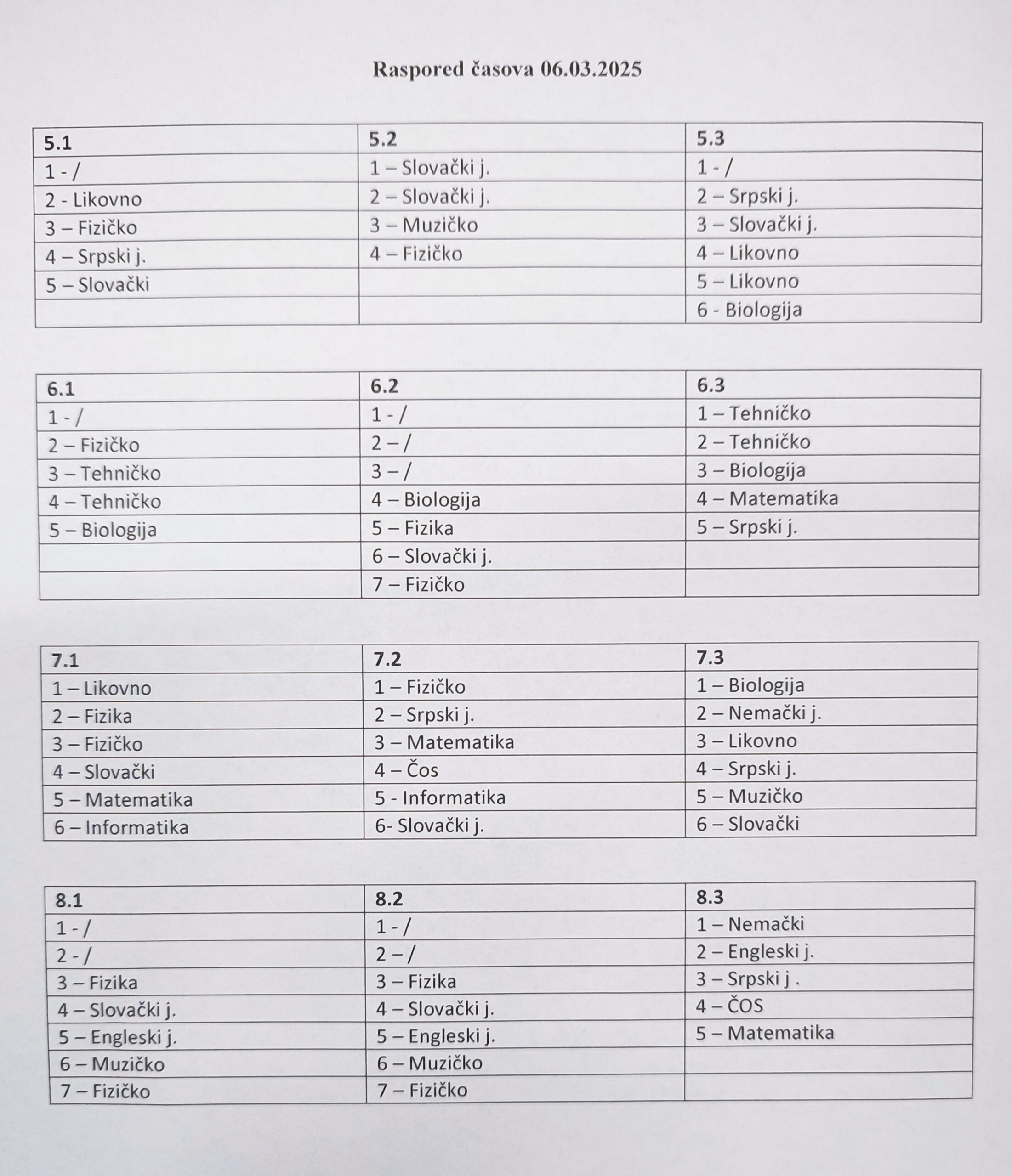 Ovim putem Vas obaveštavamo o realizaciji nastave u Školi za četvrtak, 06.03.2025. godine