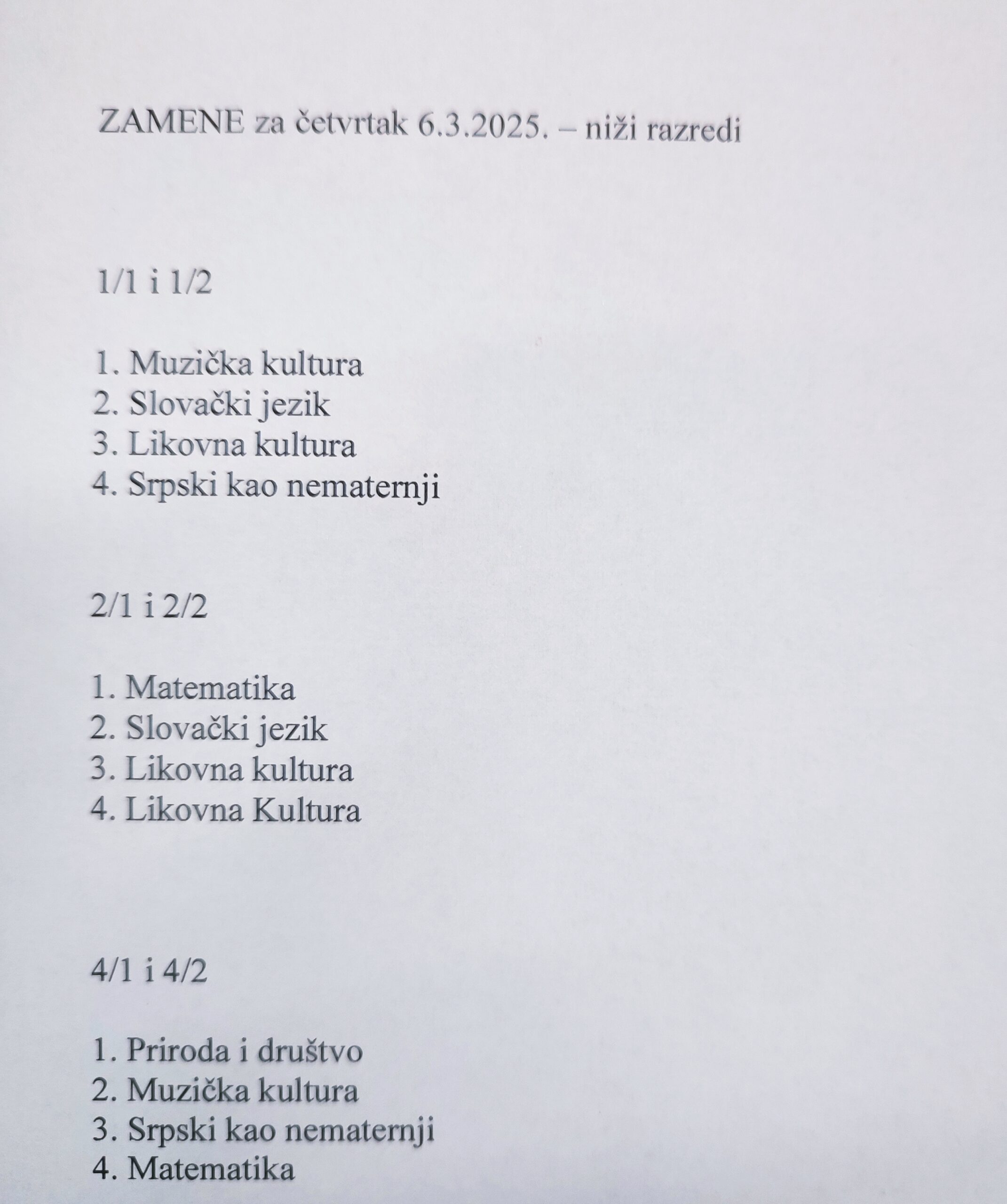 Za odeljenja nižih razreda, nastava počinje u 07:30, odeljenja čiji nastavnici su obustavili rad će imati četiri časa, časovi će trajati 45 minuta uz obezbeđene zamene. (zamene možete pogledati na slici ispod).
