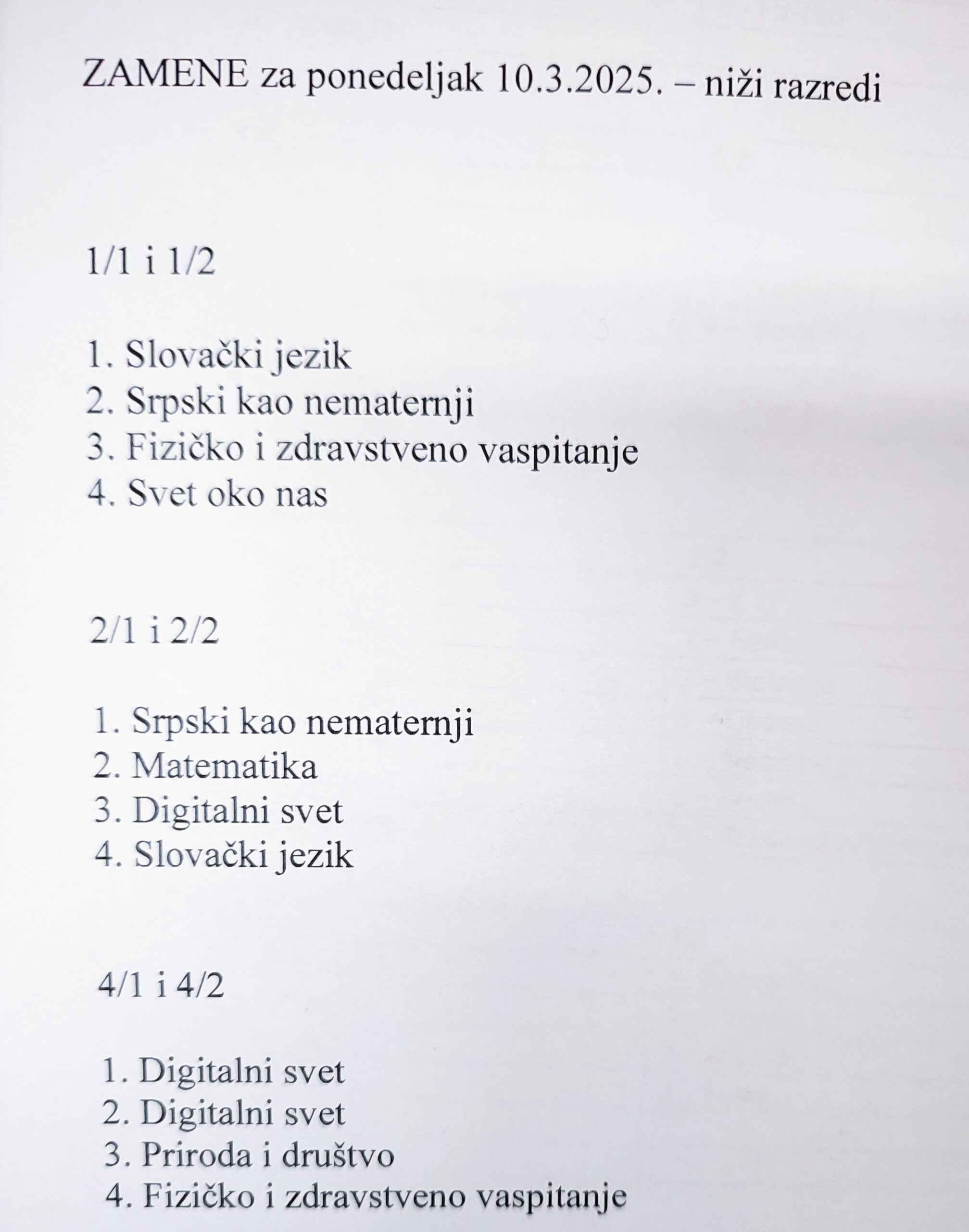Za odeljenja nižih razreda nastava počinje u 13:30. odeljenja čiji nastavnici su obustavili rad će imati četiri časa, časovi će trajati 45 minuta uz obezbeđene zamene. (zamene možete pogledati na slici ispod).