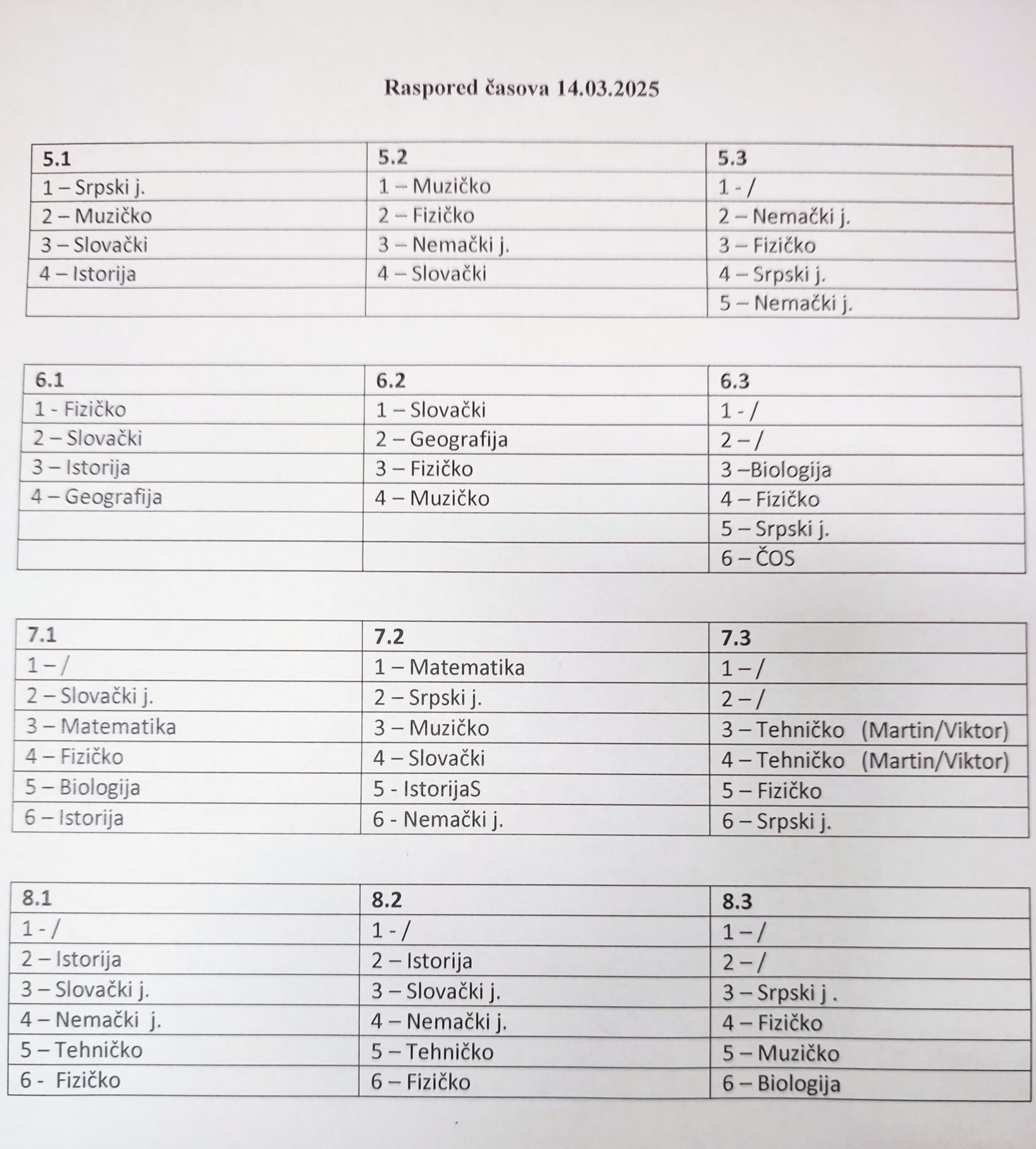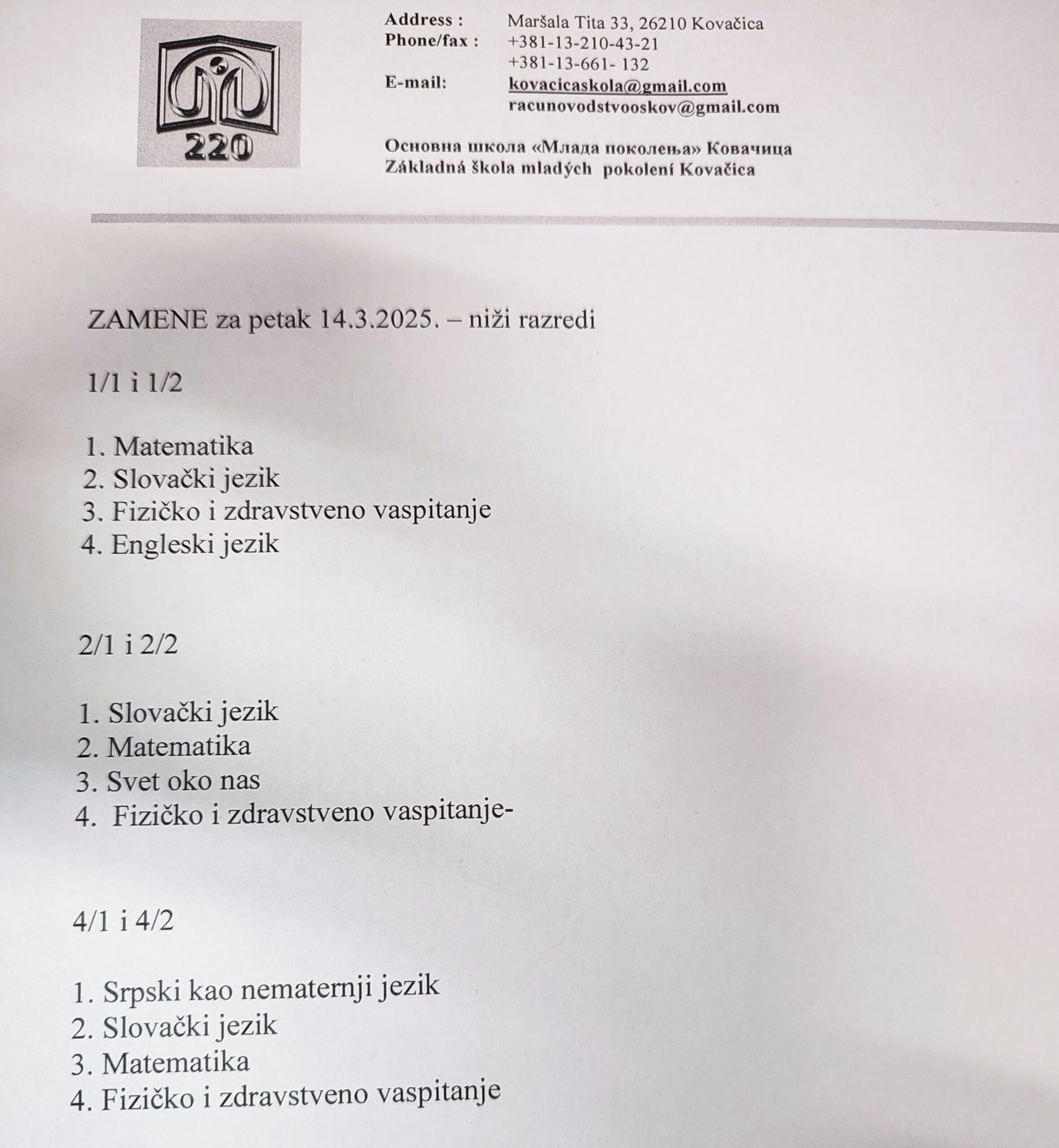 Ovim putem Vas obaveštavamo o realizaciji nastave u Školi za petak, 14.03.2025. godine