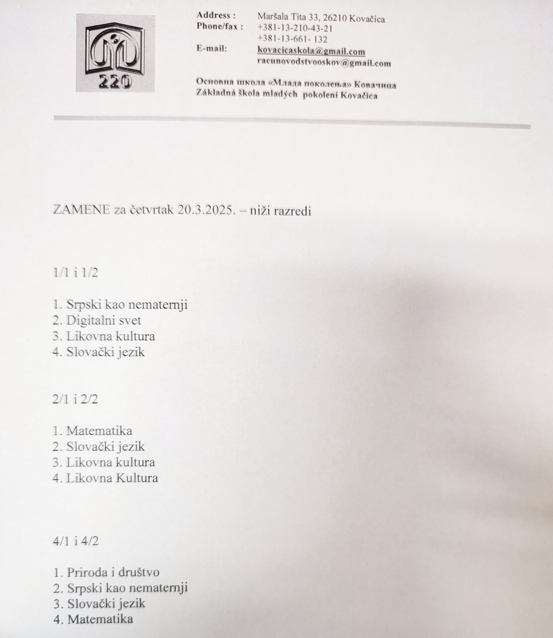 Za odeljenja nižih razreda, nastava počinje u 07:30, odeljenja čiji nastavnici su obustavili rad će imati četiri časa, časovi će trajati 45 minuta uz obezbeđene zamene. (zamene možete pogledati na slici ispod).