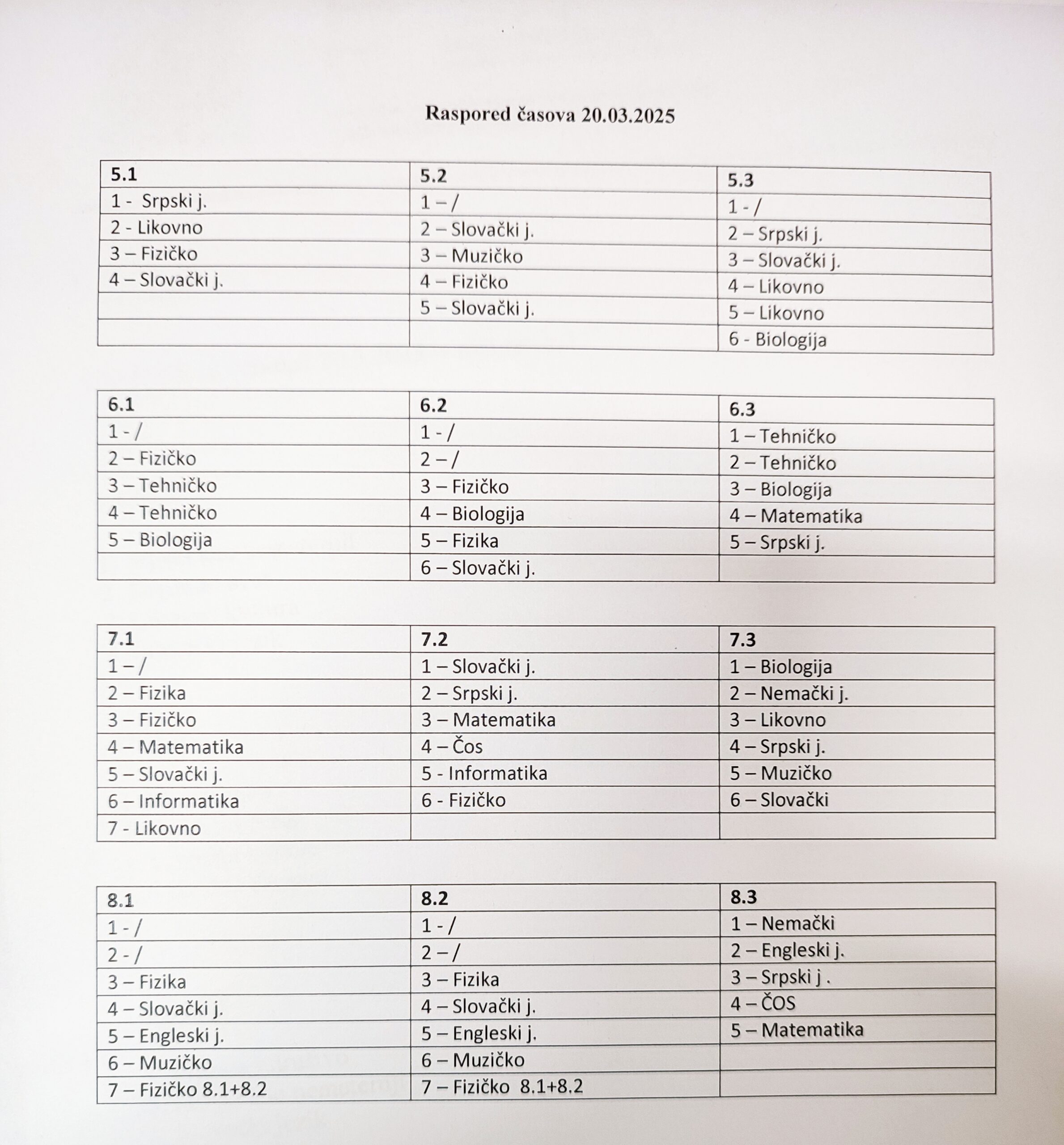 Ovim putem Vas obaveštavamo o realizaciji nastave u Školi za četvrtak, 20.03.2025. godine