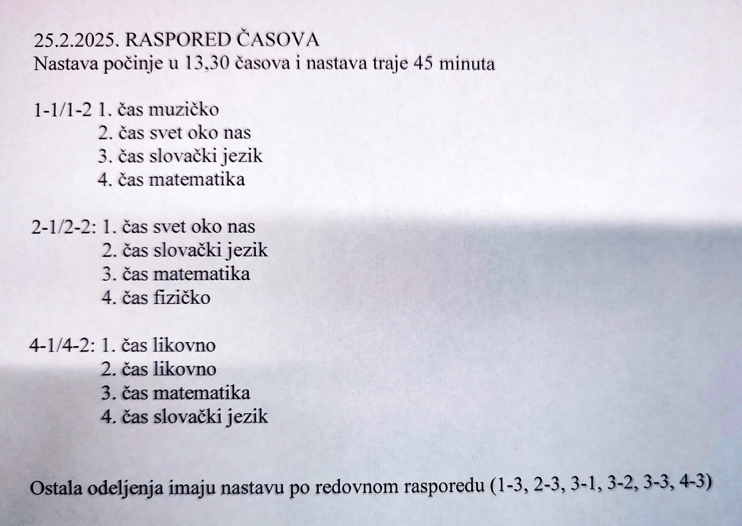Ovim putem Vas obaveštavamo o realizaciji nastave u Školi za utorak, 25.02.2025. godine