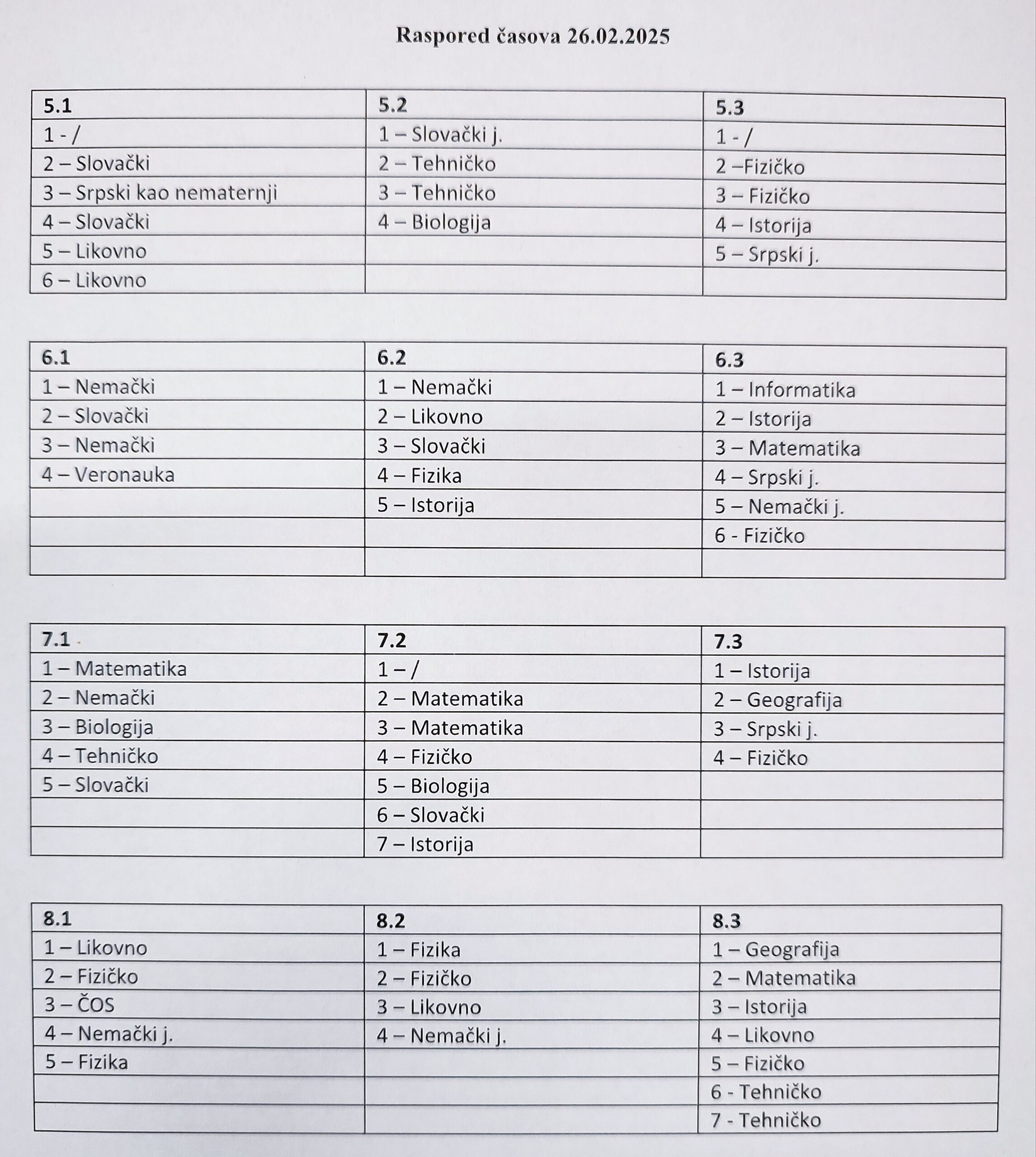 Naime, nastava za odeljenja viših razreda počinje u 7:30 po prilagođenom rasporedu časova a časovi će trajati 45 minuta, određena odeljenja nemaju prvi čas. (Ceo raspored možete pogledati na slici ispod)